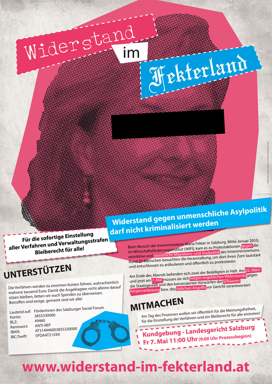 wichtig: der prozess gegen die asypolitik-kritiker ist ein zwar bedauerlicher, aber NEBENschauplatz. die hauptsache ist die menschenverachtende asylpolitik in österreich, für die fekter verantwortlich ist.