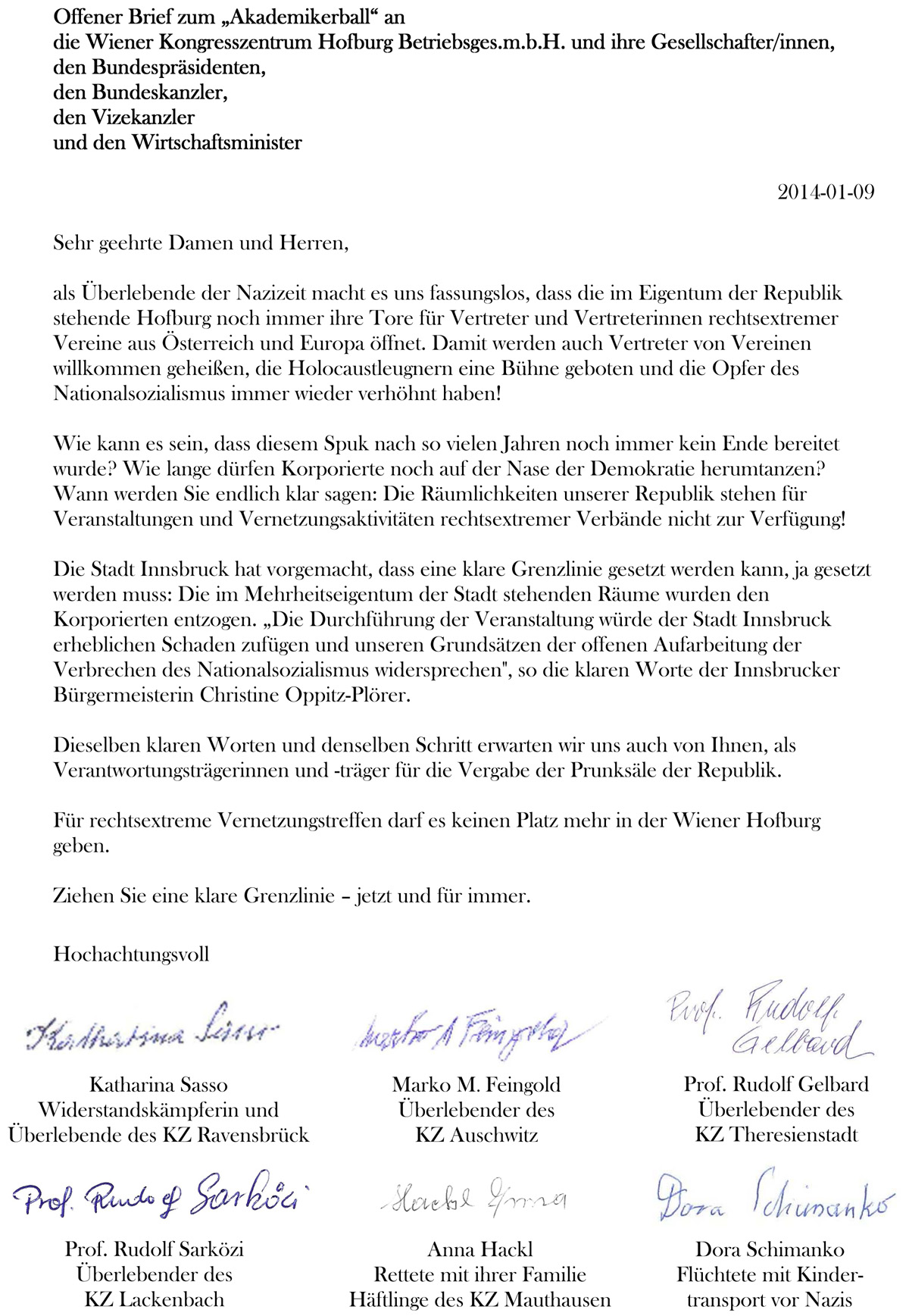 als Überlebende der Nazizeit macht es uns fassungslos, dass die im Eigentum der Republik stehende Hofburg noch immer ihre Tore für Vertreter und Vertreterinnen rechtsextremer Vereine aus Österreich und Europa öffnet. Damit werden auch Vertreter von Vereinen willkommen geheißen, die Holocaustleugnern eine Bühne geboten und die Opfer des Nationalsozialismus immer wieder verhöhnt haben!Wie kann es sein, dass diesem Spuk nach so vielen Jahren noch immer kein Ende bereitet wurde? Wie lange dürfen Korporierte noch auf der Nase der Demokratie herumtanzen? Wann werden Sie endlich klar sagen: Die Räumlichkeiten unserer Republik stehen für Veranstaltungen und Vernetzungsaktivitäten rechtsextremer Verbände nicht zur Verfügung!