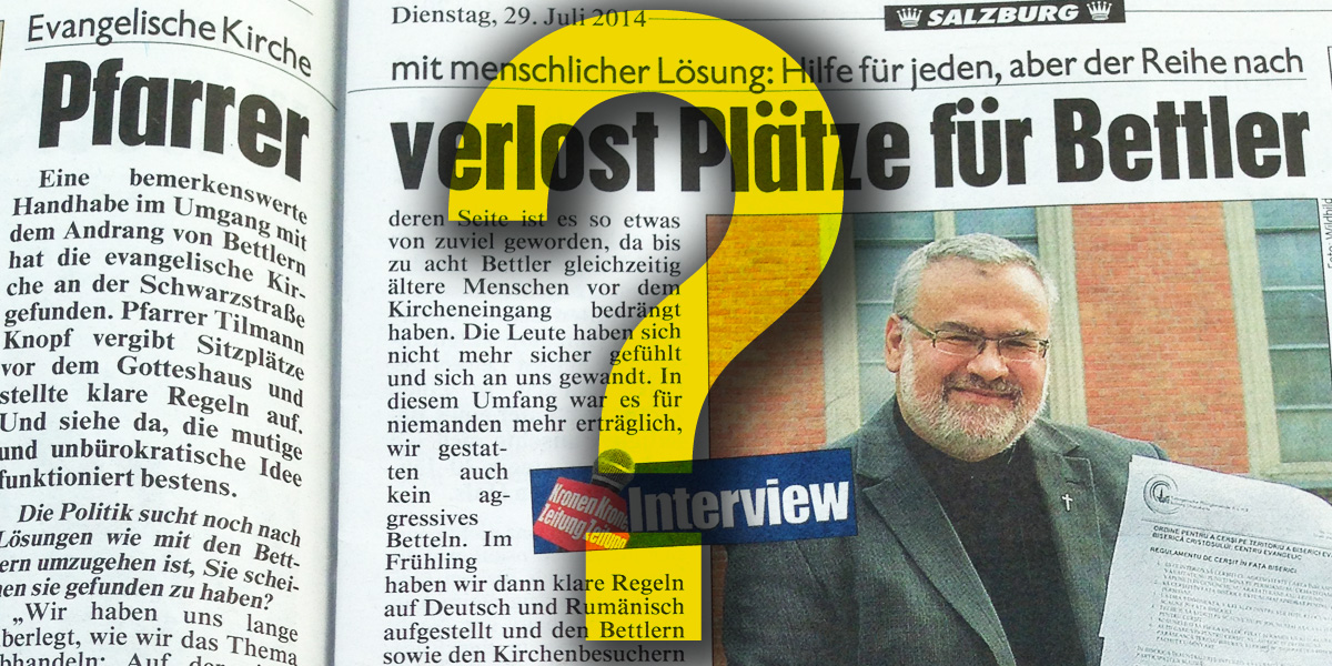 ein böses, ja zynisches gerücht wurde heute über die kronenzeitung verbreitet: mag. tilmann knopf, amtführender pfarrer der evangelischen christuskirche in salzburg würde „bettelplätze“ vor seiner kirche verlosen. (sic!) sie bekämen sitzplätze und bei regen einen schirm, aber bei vier müsse schluss sein. hier nun die echte und wahre rede von pfarrer knopf, wie er sie in wirklich halten wollte, oder doch nicht?